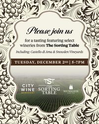 Join us for our biggest holiday tasting of the season, featuring favorite producers from The Sorting Table portfolio, including Castello di Ama, Tiberio, Domaine Roblet-Monnot, Snowden Vineyards, Champagne Michel Mailliard, and more!